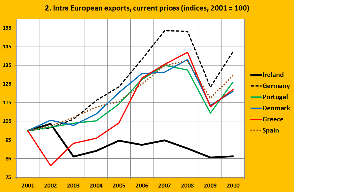 But this improvement is not caused by an increase in exports of goods. Ireland is in fact an example of ‘how not to do it’, when it comes to exporting. When we look at intra-European Union exports we see that exports of the other ‘GIPSD-countries'(Greece, Ireland, Portugal, Spain, Denmark) increased only a little less than German exports (graph 2, larger version here) – the 2010 level was about 25% higher than the 2001 level. 2010 Irish exports, to the contrary, were in fact lower than in 2001 and still (Juli 2011) do not show much increase.