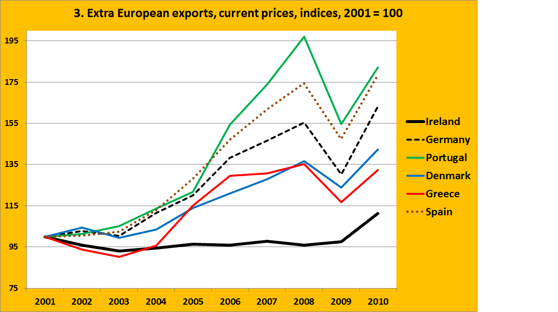 When we look at extra-European Union exports (graph 3, larger version here) a somewhat comparable pattern surfaces. Total increase in higher, but Ireland comes last (and Germany is surely not first).
